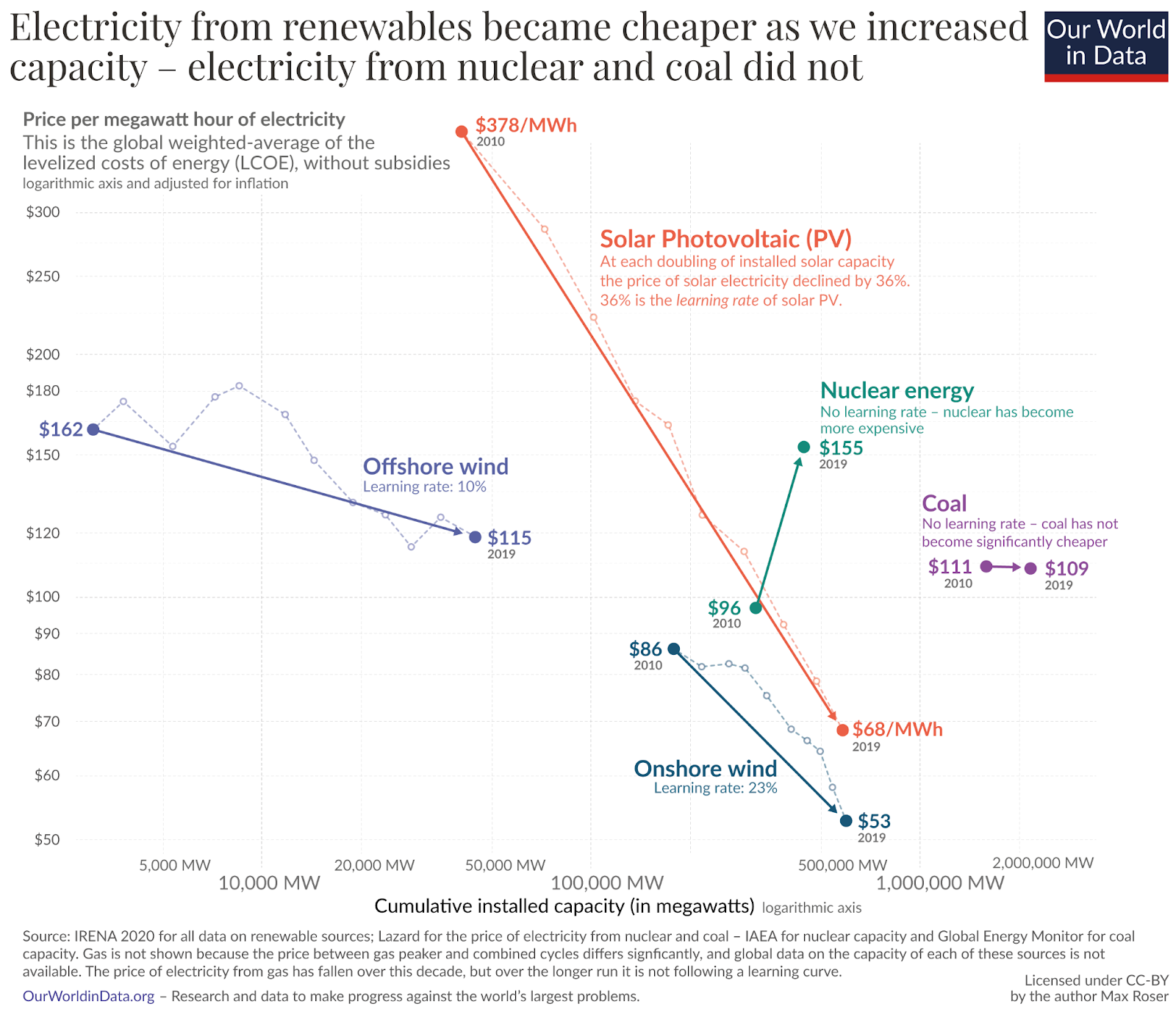 Max Roser (2020) — “Why did renewables become so cheap so fast?” Published online at OurWorldInData.org. Retrieved from: https://ourworldindata.org/cheap-renewables-growth