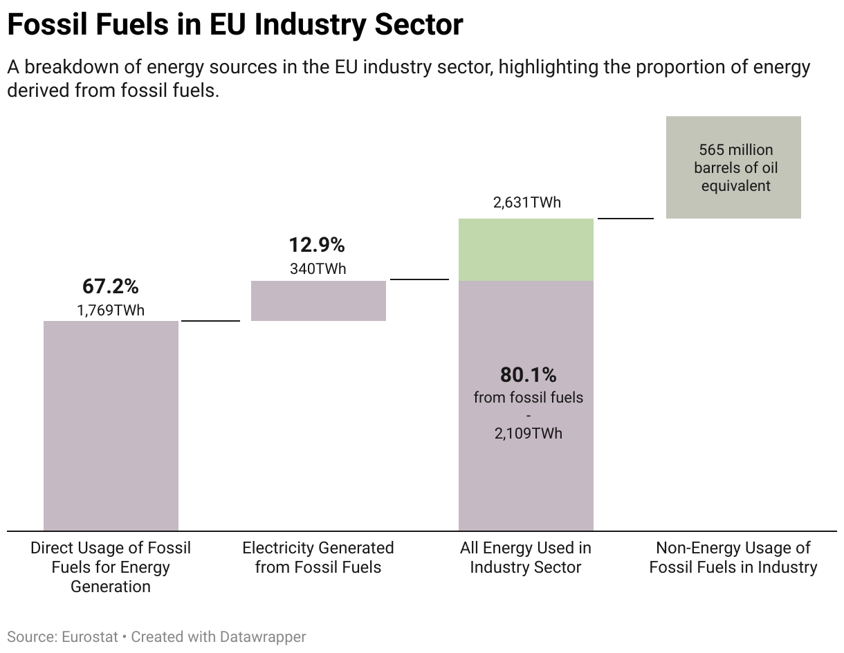 Heavy industries such as cement and steel remain “hard to abate” sectors due to technological and economic barriers. This is mainly due to the non-energy usage of fossil fuels, such as feedstocks for plastics, fertilizer, and steel production, and the high energy intensity of non-fossil alternatives. In the breakdown (figure 2) we can see a detail of the industry sector in EU(27) in 2022.