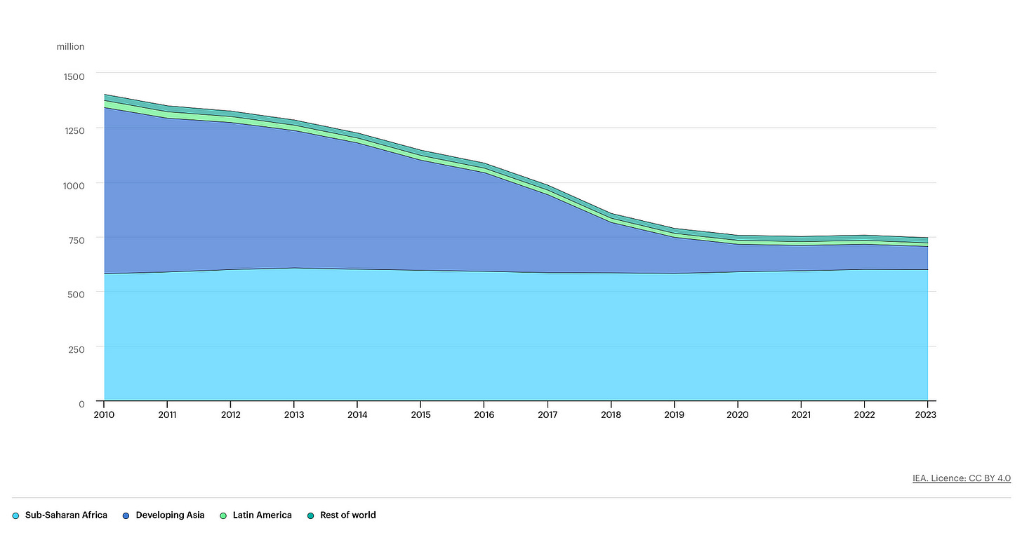 IEA (2023), Number of people without access to electricity by region, 2010–2023, IEA, Paris https://www.iea.org/data-and-statistics/charts/number-of-people-without-access-to-electricity-by-region-2010-2023