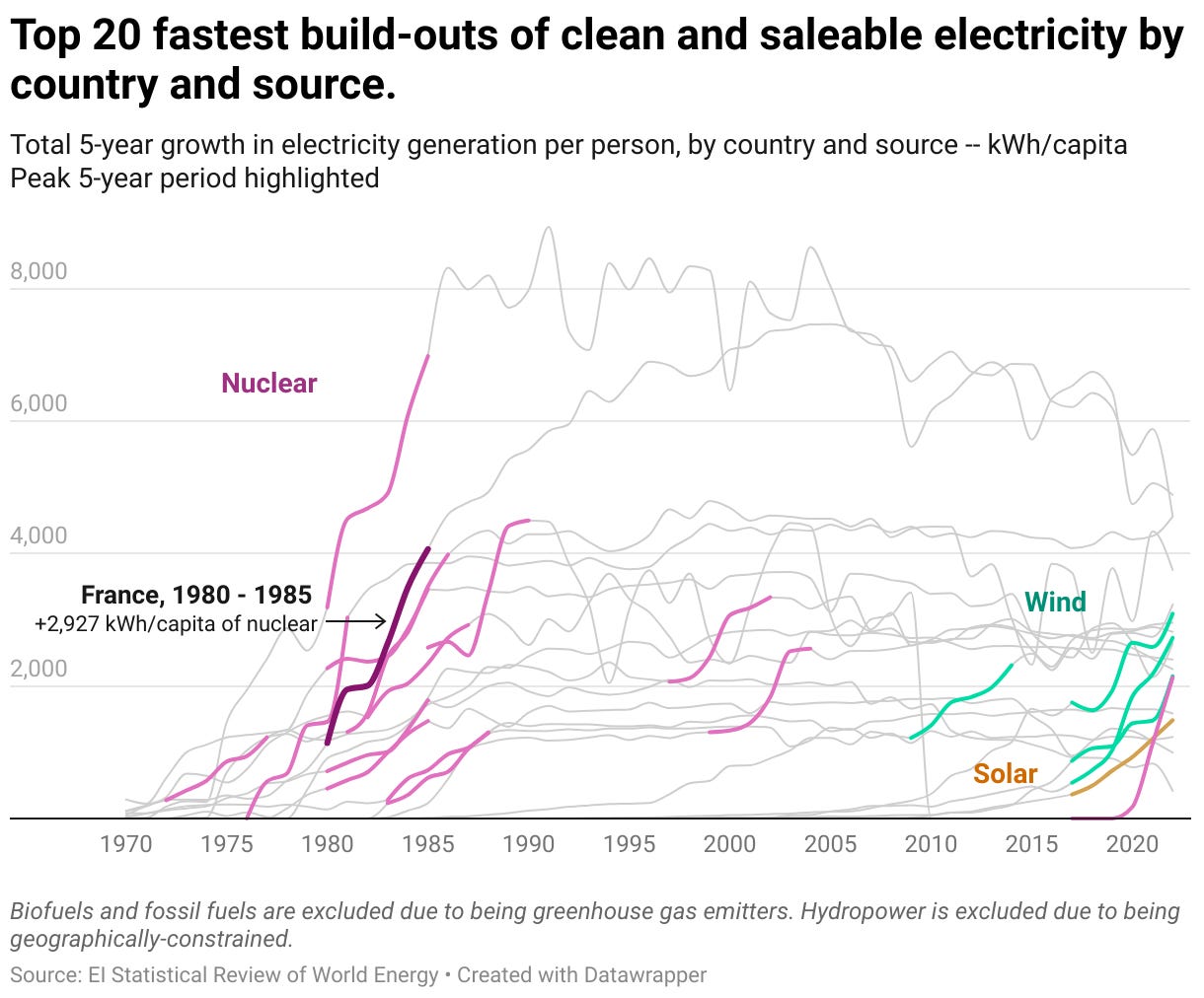 The French nuclear program, a notable historical exception, built 54 nuclear reactors over 15 years, achieving one of the fastest decarbonizations ever seen in an industrialized country. Today, this fleet still operates, providing stable, inexpensive, and clean energy to France and its neighbors.